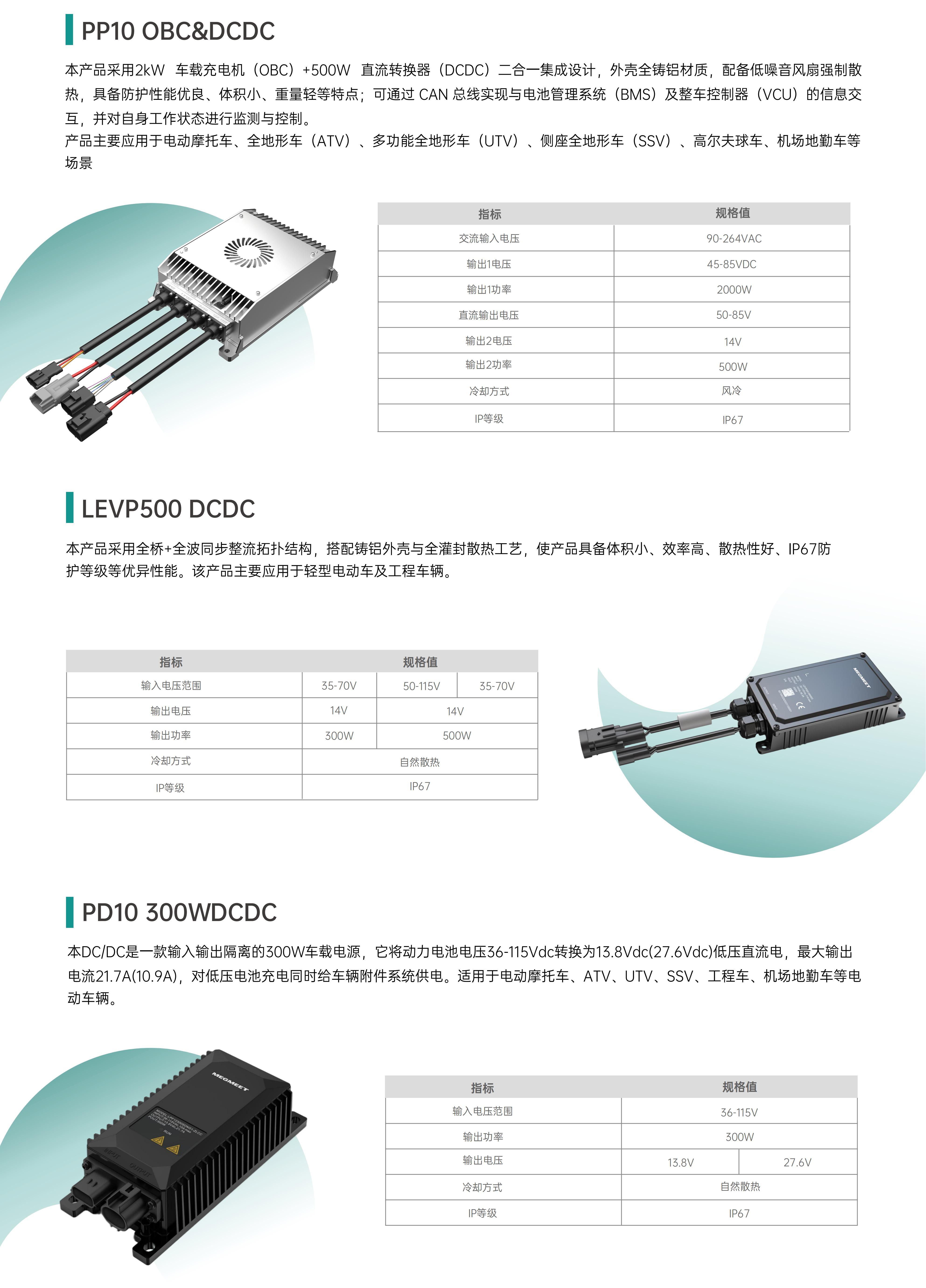 充電產(chǎn)品包括DC/DC電源、便攜式充電機、OBC+DC/DC二合一電源等